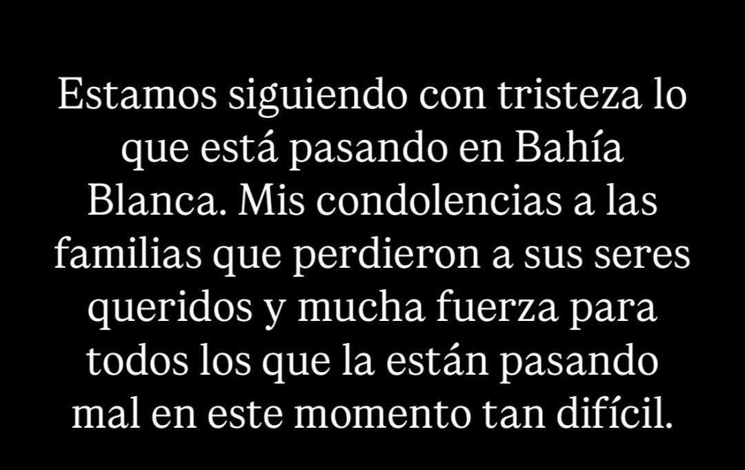 “Estamos siguiendo con tristeza lo que está pasando en Bahía Blanca” escribió el 10. “Mis condolencias a las familias que perdieron a sus seres queridos y mucha fuerza para todos los que la están pasando mal en este momento tan difícil".