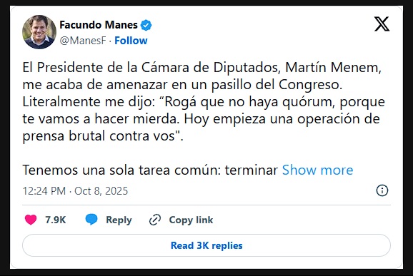 “El presidente de la Cámara de Diputados, Martín menem, me acaba de amenazar en un pasillo del Congreso”, posteó Manes, quien al contar el altercado llamó a “terminar con esta locura en la Argentina”.