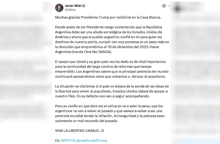 Muchas gracias Presidente Trump por recibirme en la Casa Blanca", comenzó Milei su posteo en la red social X. Allí, reafirmó su promesa de campaña de convertir a Argentina en un "aliado estratégico" de Estados Unidos, un paso que consideró fundamental para "Hacer Argentina Grande Otra Vez (MAGA)", en un claro guiño al eslogan de su par norteamericano.
