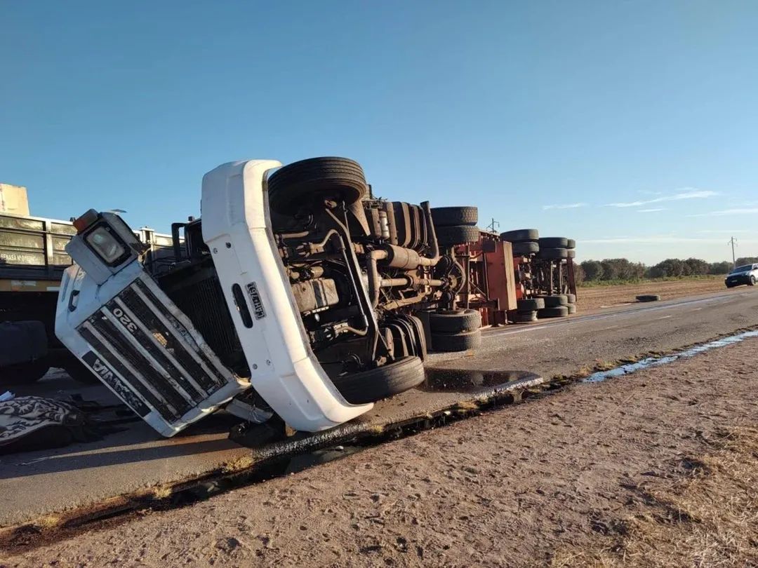 Un camión Scania modelo 113, con acoplado, volcó en la Ruta Provincial N° 5, a 3 km del Puesto Caminero, en dirección este. El vehículo era conducido por Kevin Ismael Villacorta, de 22 años, quien resultó ileso.