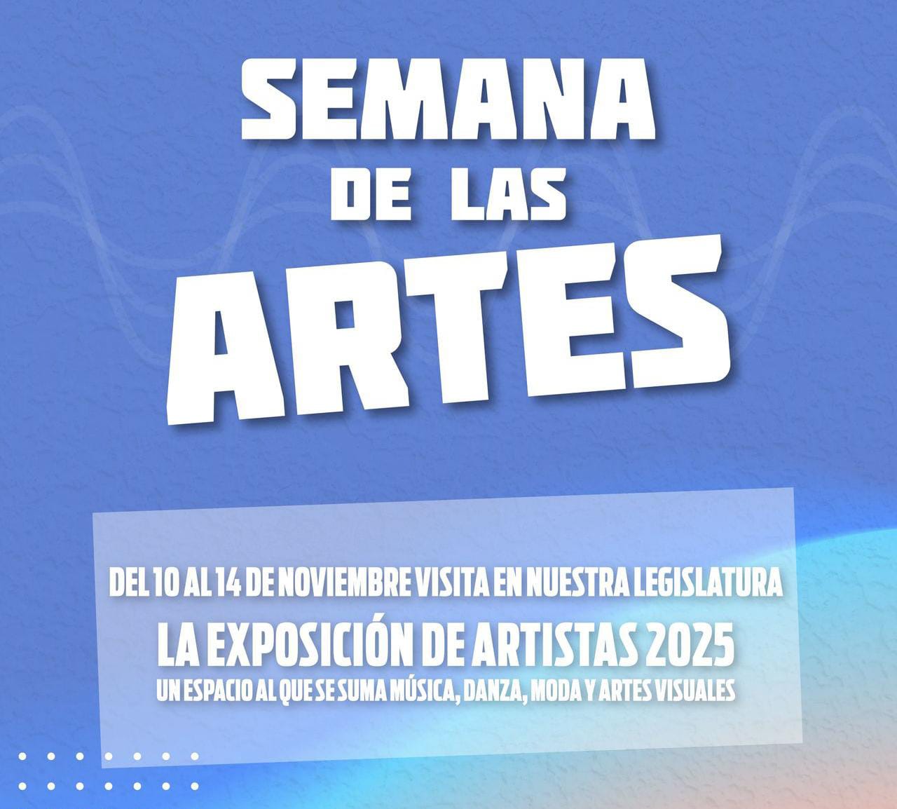 La Cámara de Diputados de la Provincia de La Rioja invita a la comunidad a participar de la Semana de las Artes, una propuesta cultural que se desarrollará del 10 al 14 de noviembre en las instalaciones de la Legislatura.