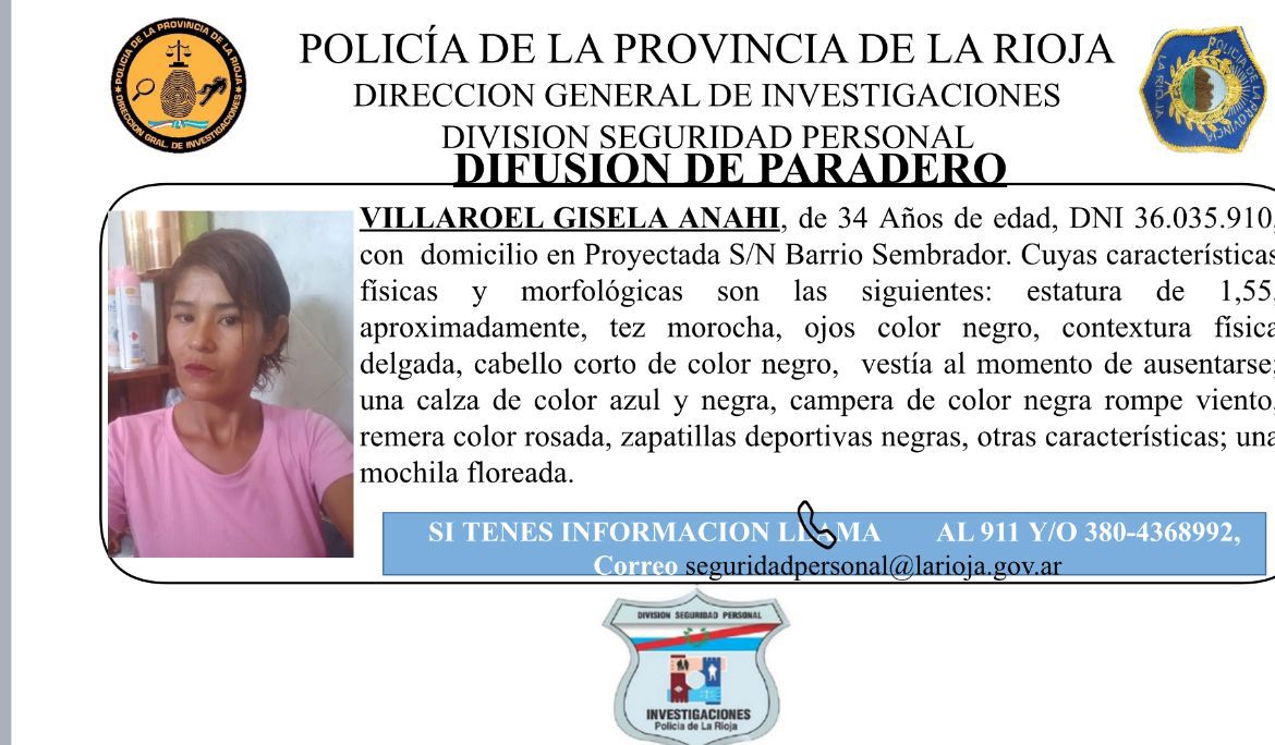 La Policía de la Provincia de La Rioja, a través de la Dirección General de Investigaciones y la División Seguridad Personal, emitió una solicitud de paradero para dar con el paradero de Villarroel Gisela Anahí, de 34 años de edad, quien se encuentra ausente de su domicilio ubicado en Proyectada S/N, barrio Sembrador.