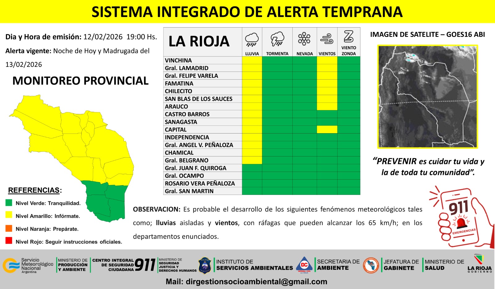 Según el reporte oficial, la alerta por lluvias alcanza a los departamentos Vinchina, General Lamadrid, General Felipe Varela, Famatina, Chilecito, San Blas de los Sauces, Arauco, Castro Barros, Sanagasta, Capital, Independencia, General Ángel Vicente Peñaloza, Chamical y General Belgrano.