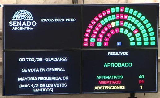 Tras poco más de cuatro horas de debate, el Senado dio media sanción a la modificación en general a la Ley de Glaciares N° 26.639 por 40 votos a favor, 31 en contra y 1 abstención.