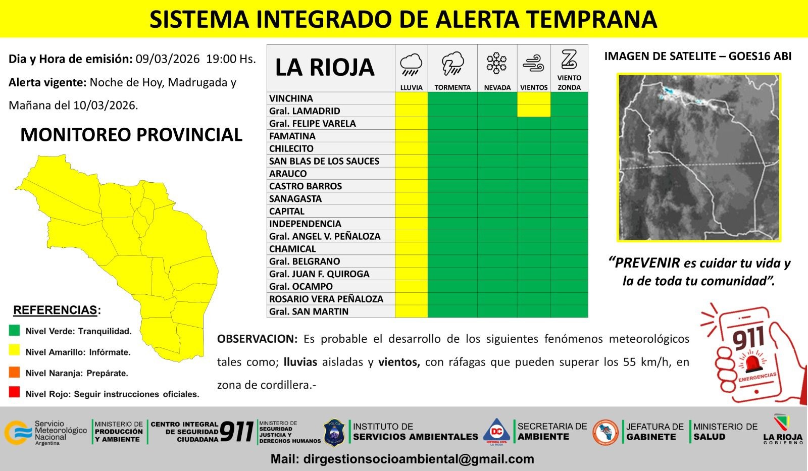 El Comité de Emergencia (COE) La Rioja emitió una Alerta Amarilla por lluvias, en todo el territorio provincial, y viento, específicamente en zona de cordillera. Esta alerta rige para la noche del lunes 9 y madrugada del martes 10 de febrero.