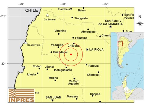 Su epicentro fue a 21 km al SO de Vichigasta; 48 km al S de Chilecito; 65 km al NE de Ischigualasto -29.62 (lat) -67.624 (long), profundidad de 112 Km.