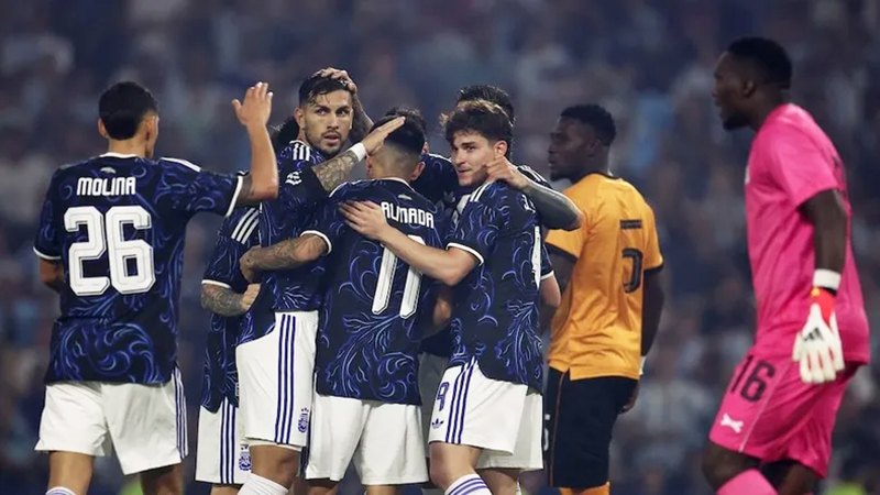 A los tres minutos, el delantero Julián Álvarez recibió dentro del área un pase del astro argentino Lionel Messi, que había rozado el mediocampista Thiago Almada, y remató de primera, con un tiro bajo y cruzado que abrió al marcador.