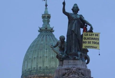 Un activista se trepó a un monumento situado en el Congreso de la Nación para colocar dos banderas a modo de protesta en rechazo a la reforma a la Ley de Glaciares.