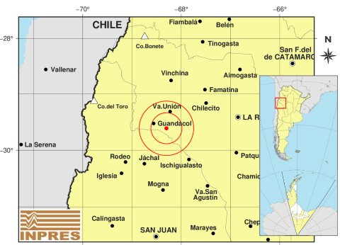 27 km al E de Guandacol; 63 km al NO de Ischigualasto; 81 km al O de Vichigasta -29.611 (lat) -68.3 (long). Su profundidad fue de 10 Km.