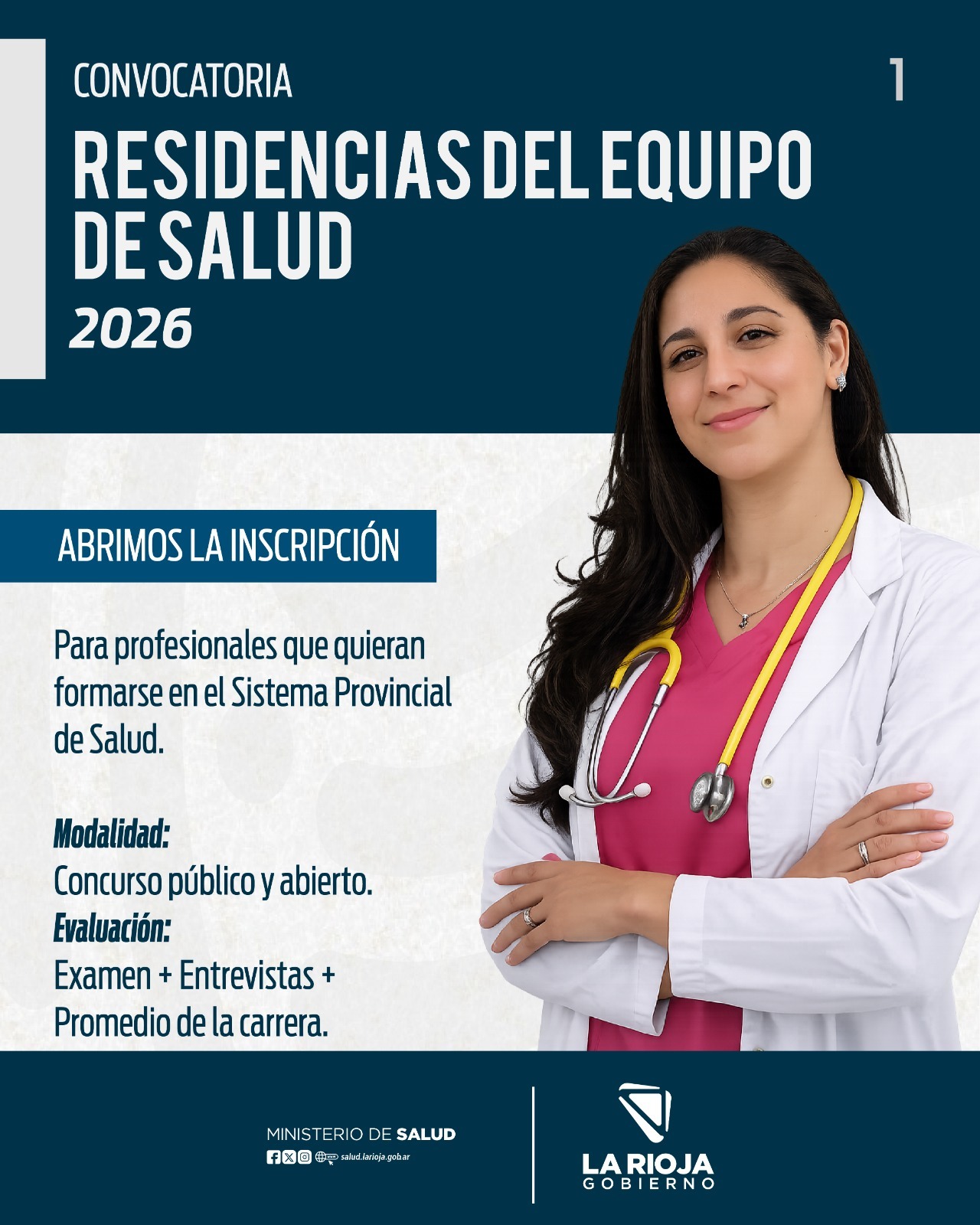 El Ministerio de Salud de La Rioja informó que ya se encuentran abiertas las preinscripciones al Concurso Provincial de Residencias del Equipo de Salud 2026, instancia que permanecerá habilitada hasta el próximo 30 de abril.