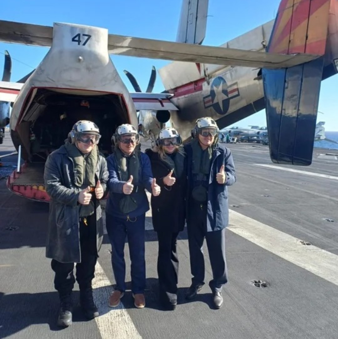 El traslado del mandatario se llevó a cabo de un Grumman C-2 Greyhound estadounidense, la aeronave de transporte que opera desde y hacia la cubierta del portaaviones; su visita coincidió con una demostración aérea de aviones F-18 y helicópteros MH-60 Seahawk, que forma parte del programa del último día de ejercicios.