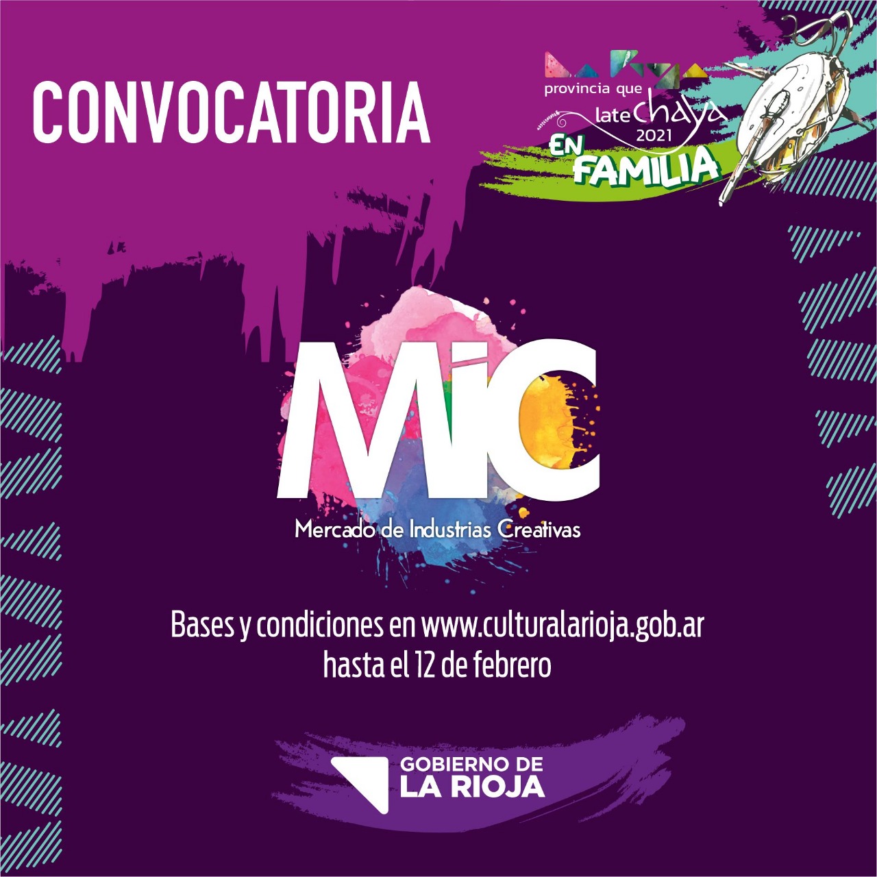 El Gobierno de La Rioja, a través de la Secretaría de Culturas y el Ministerio de Turismo y Culturas, invitan a participar del MERCADO DE LAS INDUSTRIAS CREATIVAS (MIC), que se llevará a cabo en el mes de febrero en formato FERIA, con la finalidad de muestra, intercambio y venta de objetos culturales. Será del 18 al 21 de febrero, de 19 a 00 horas en el Parque de la Ciudad de La Rioja.