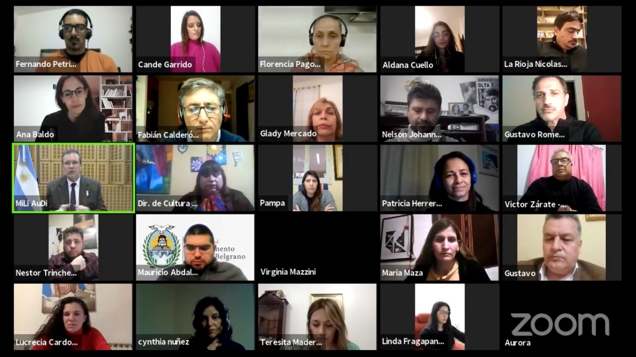 Participaron, de manera virtual, el ministro de Cultura de la Nación Tristán Bauer; la secretaria de Desarrollo Cultural de la Nación, Lucrecia Cardozo; la Diputada Provincial, Teresita Madera; el ministro de Turismo y Culturas de La Rioja, Gustavo Luna; la secretaria de Culturas de La Rioja, Patricia Herrera; el subsecretario de Gestión Cultural, Nicolás Halkett; el rector de la Universidad Nacional de La Rioja, Fabián Calderón; y acompañaron también diferentes autoridades de cultura de todo el territorio provincial.