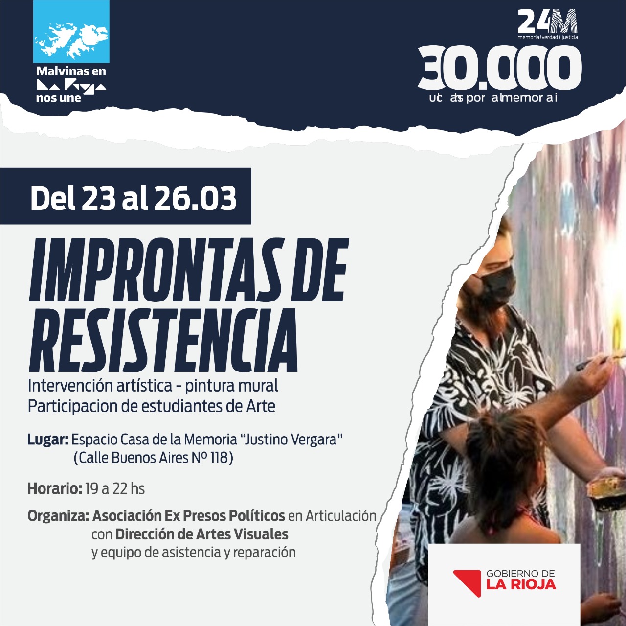 Desde el 23 al 26 de marzo, en conmemoración al Día de la Memoria, Verdad y Justicia, con la participación de estudiantes de arte, se estará realizando la intervención artística “Improntas de resistencia”.