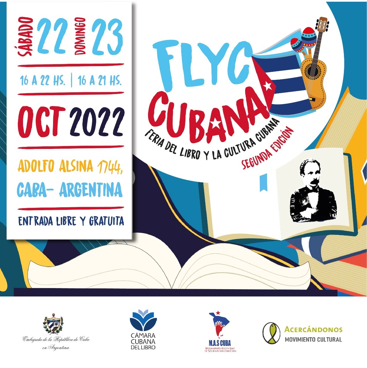 Asimismo, invitan a la segunda edición de la Feria del Libro y Cultura Cubana, la Embajada de Cuba en Argentina, Cámara del Libro de Cuba, Acercándonos Ediciones, Movimiento de Solidaridad Argentino Cubana.