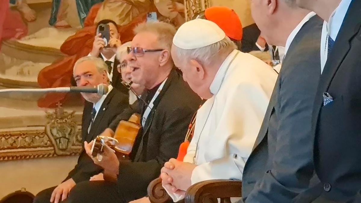 El compositor y cantante León Gieco cantó este viernes su emblemática canción "Solo le pido a Dios" ante el papa Francisco y más de un centenar de dirigentes argentinos que participaron en el Vaticano de un congreso en honor a los diez años de pontificado de Jorge Bergoglio, organizado por el Instituto de Diálogo Interreligioso (IDI).