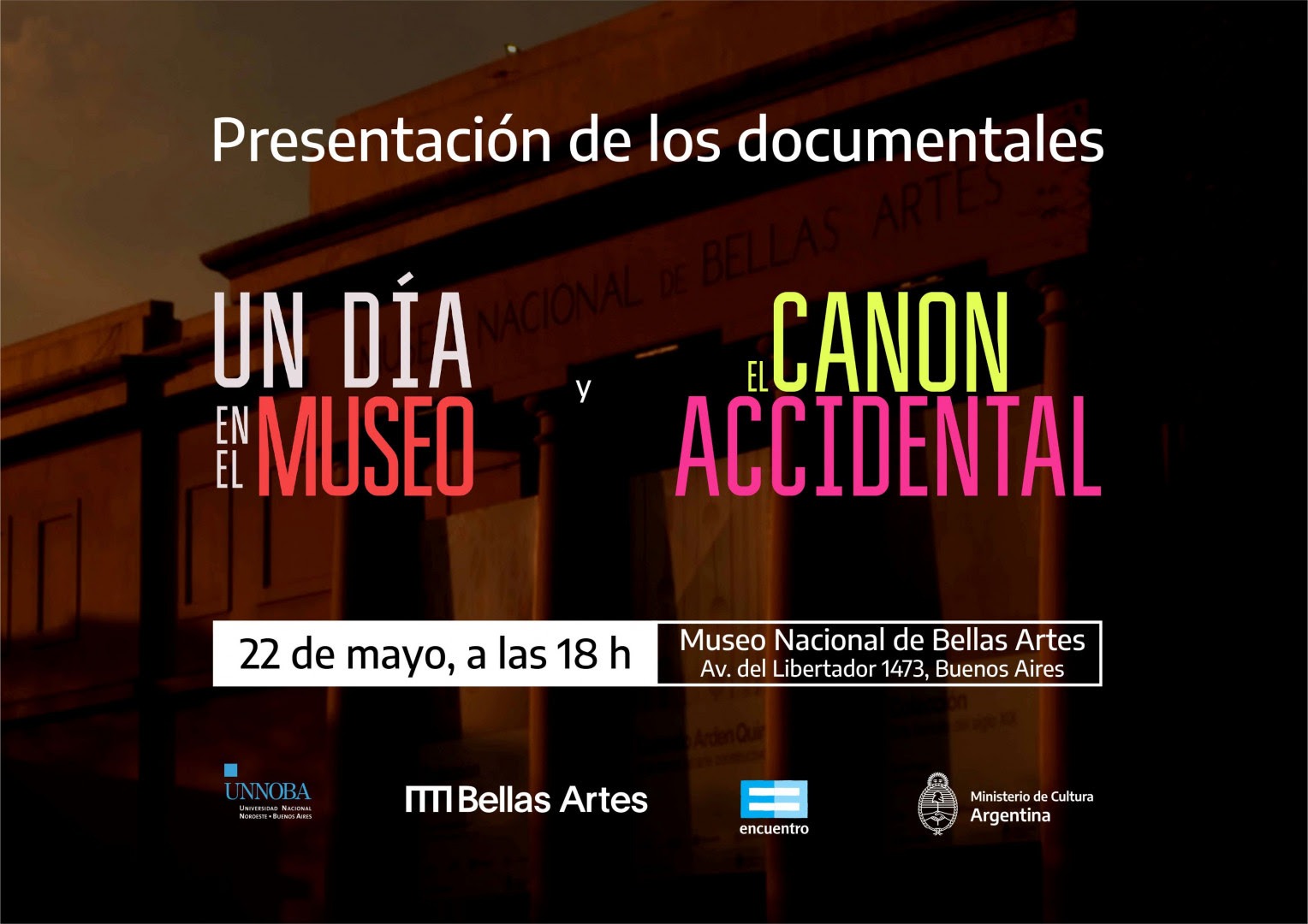 El lunes 22 de mayo a las 18 se presentarán “Un día en el museo” y “El canon accidental” en el Museo Nacional de Bellas Artes. Son documentales coproducidos por el Ministerio de Cultura de la Nación y Canal Encuentro, y realizados por la Universidad Nacional Noroeste de Buenos Aires. Los films, que forman parte de la programación 2023 de la señal educativa, ofrecen una aproximación a las obras y al interior del Bellas Artes, uno de los museos públicos más importantes de la región.