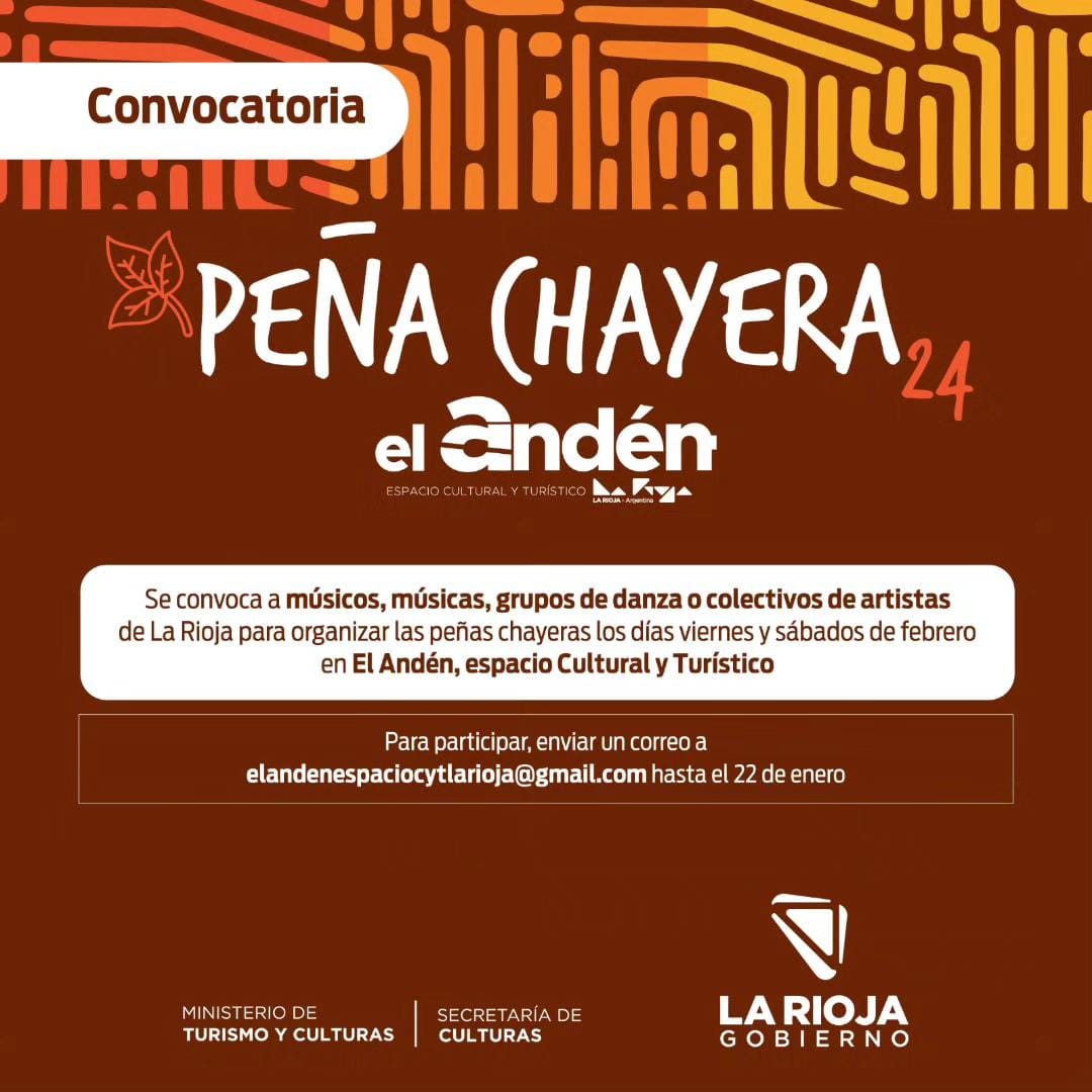 El Gobierno de La Rioja, a través de su Secretaría de Culturas del Ministerio de Turismo y Culturas, abrió la convocatoria para participar de "Peña Chayera 2024" durante el mes de febrero, en El Andén, espacio Cultural y Turístico.