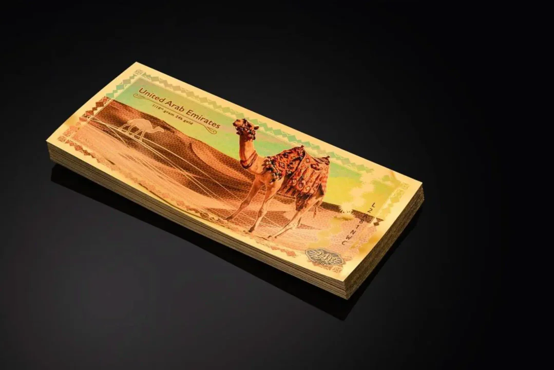 La tienda alibaba ya ofrece el billete de oro puro de 24k, billete de Dubái, dirham 500, para souvenirs de negocios. Rinde homenaje al histórico comercio del oro en la ciudad.