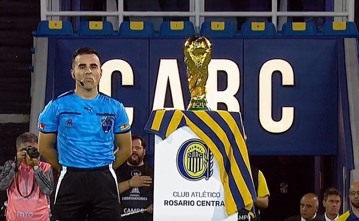 El conjunto rosarino colocó una tarima en la entrada por donde ingresaron los futbolistas, adornada con los colores del club, y con una copa del mundo encima de la misma para recordar a Menotti, entrenador de la Selección argentina campeona del mundo en 1978.