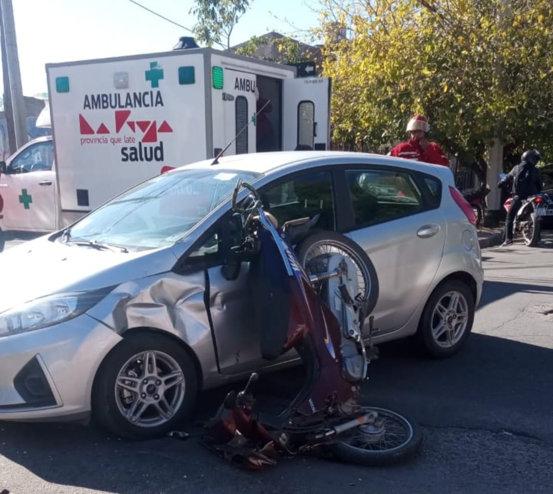 El siniestro vial ocurrió este mediodía en calles España y Berutti del barrio 3 de Febrero de la ciudad de La Rioja. Ana Crovara de Santa María (73) conducía un automóvil Ford Fiesta, color gris y, por razones que se investigan colisionó con Lucas Cerezo (19) quien iba acompañado por Anabel Cerezo en una motocicleta Honda Wave color bordó. Tras el impacto, los ocupantes del rodado menor sufrieron traumatismos varios.