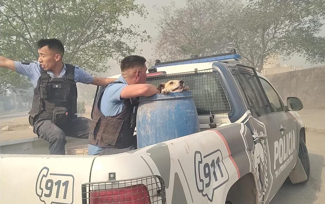 En este sentido, indicaron que fueron varios los animales que, afortunadamente, lograron rescatar entre las llamas. “Eran conejos, el perrito, como así también varios caballos. Eran de una finca en la que no estaban los propietarios, así que tuvimos que hacer ingreso, rompiendo las cerraduras donde estaban los caballos y ahí darles vía libre para que no se vayan a donde estaba el fuego. Donde estaban los conejos también rompimos la cerradura, hicimos ingreso al corral, los envolvimos adentro de una campera de nuestro uniforme, los tapamos para que no les afecte el humo y sacamos también al perrito que estaba escondido adentro, con miedo, porque las llamas ya estaban llegando a los corrales. Se logró sacar seis conejos, el perrito y cerca de ocho caballos”, relató el oficial Tejada, añadiendo: “Fue una gran labor con el tercio de la Comisaría y conjuntamente con mi compañero, con quien salgo en la foto; subimos los animales a la caja del móvil para traerlos a salvo a la Comisaría. Se les dio agua y se los limpió por el humo”.