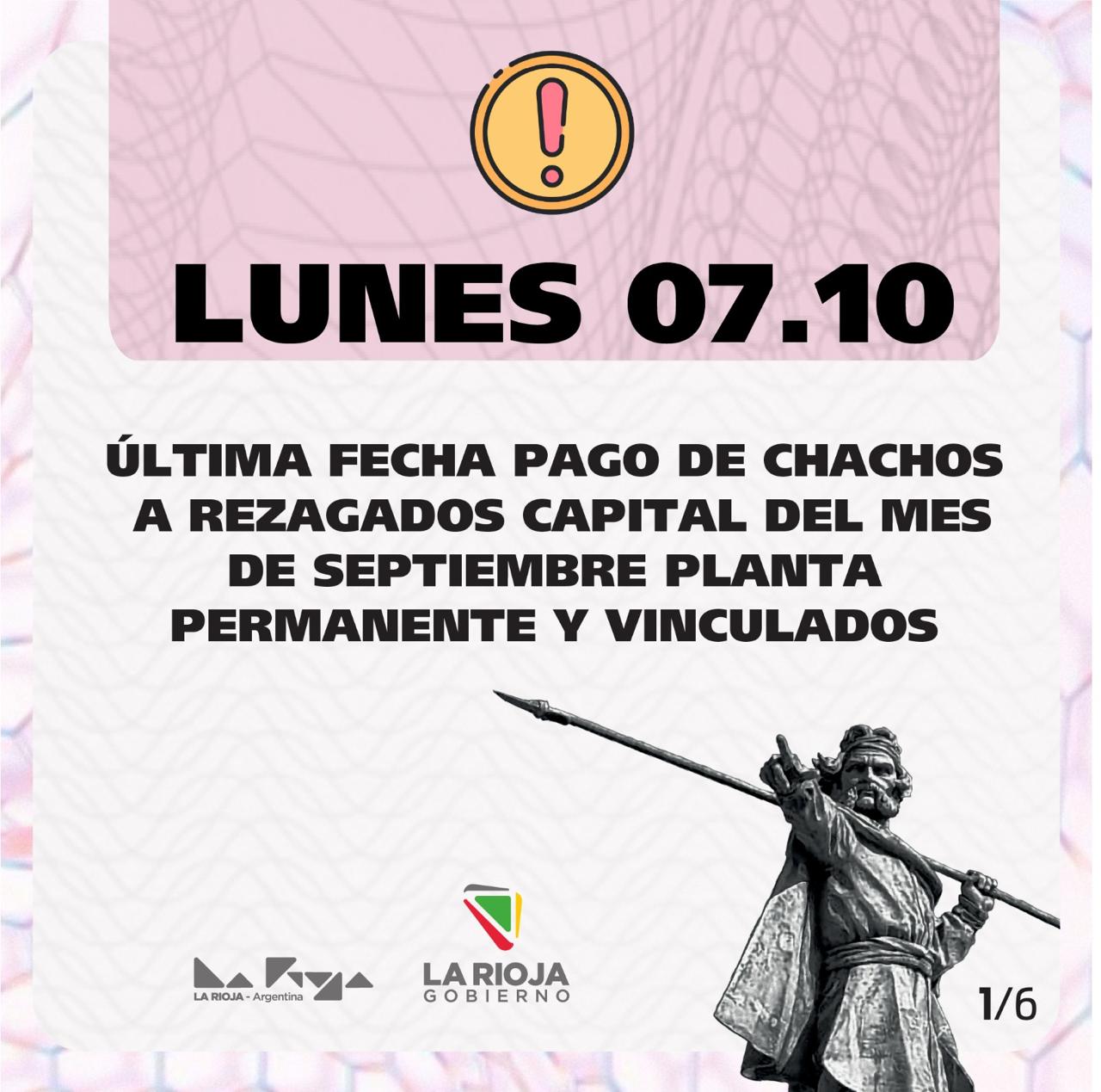 Como última fecha de cobro de Chachos del mes de septiembre para los rezagados de Planta y Vinculados, el gobierno dispuso que se pague el lunes 7 de octubre en el Polideportivo Carlos Saúl Menem, Cepar Norte y Centro Comercial, en horario de 15 30 a 20 horas.