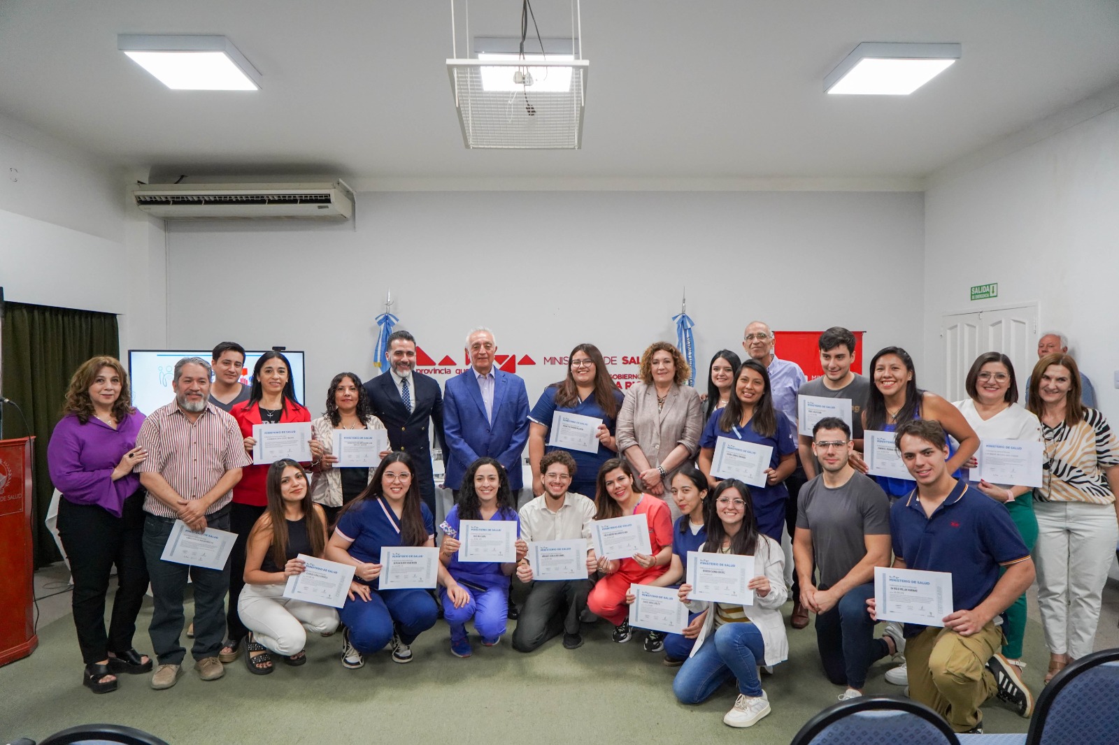 En un acto realizado en el Ministerio de Salud, 27 estudiantes de los últimos años de las carreras de Medicina de la Universidad Nacional de La Rioja (UNLaR) y del Instituto Universitario de Ciencias de la Salud Fundación Barceló recibieron sus certificados tras completar la capacitación como promotores de salud. Esta formación se desarrolló en el marco del programa Ciudadanía Sanitaria.