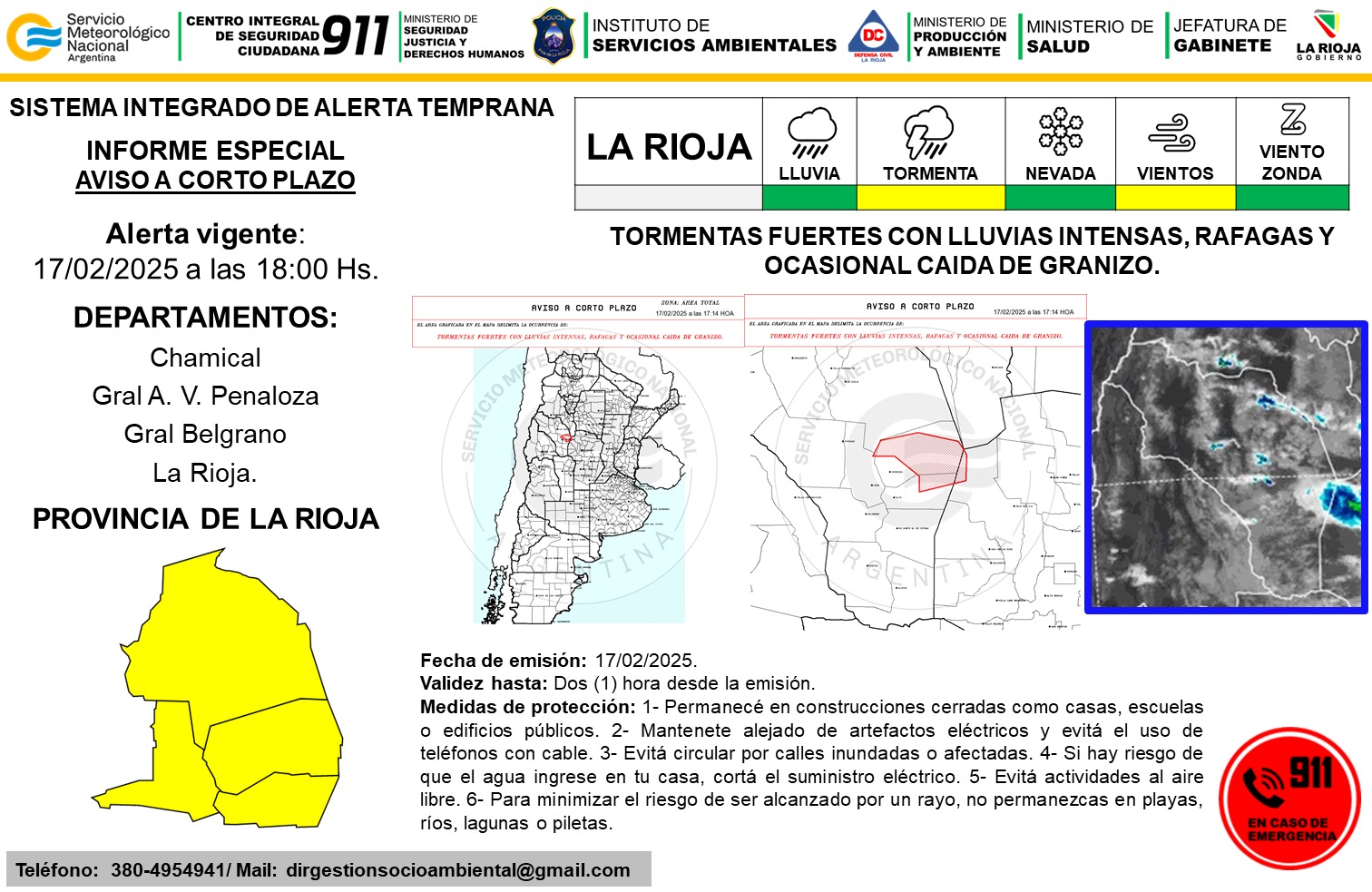 Para lo que resta de la jornada del lunes 17, rige alerta por tormentas fuertes con lluvias intensas, ráfagas y ocasional caída de granizo para los departamentos Chamical, General Ángel Vicente Peñaloza, General Belgrano y Capital