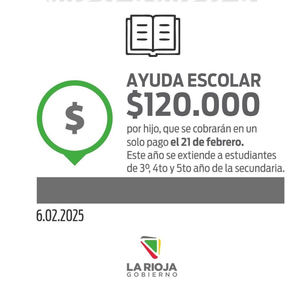 El Gobierno de La Rioja hará efectivo el pago del beneficio Ayuda Escolar para estudiantes regulares que concurren a los niveles obligatorios del sistema educativo provincial. Se abonará este viernes 21, en un solo pago y por un monto de 120 mil pesos.