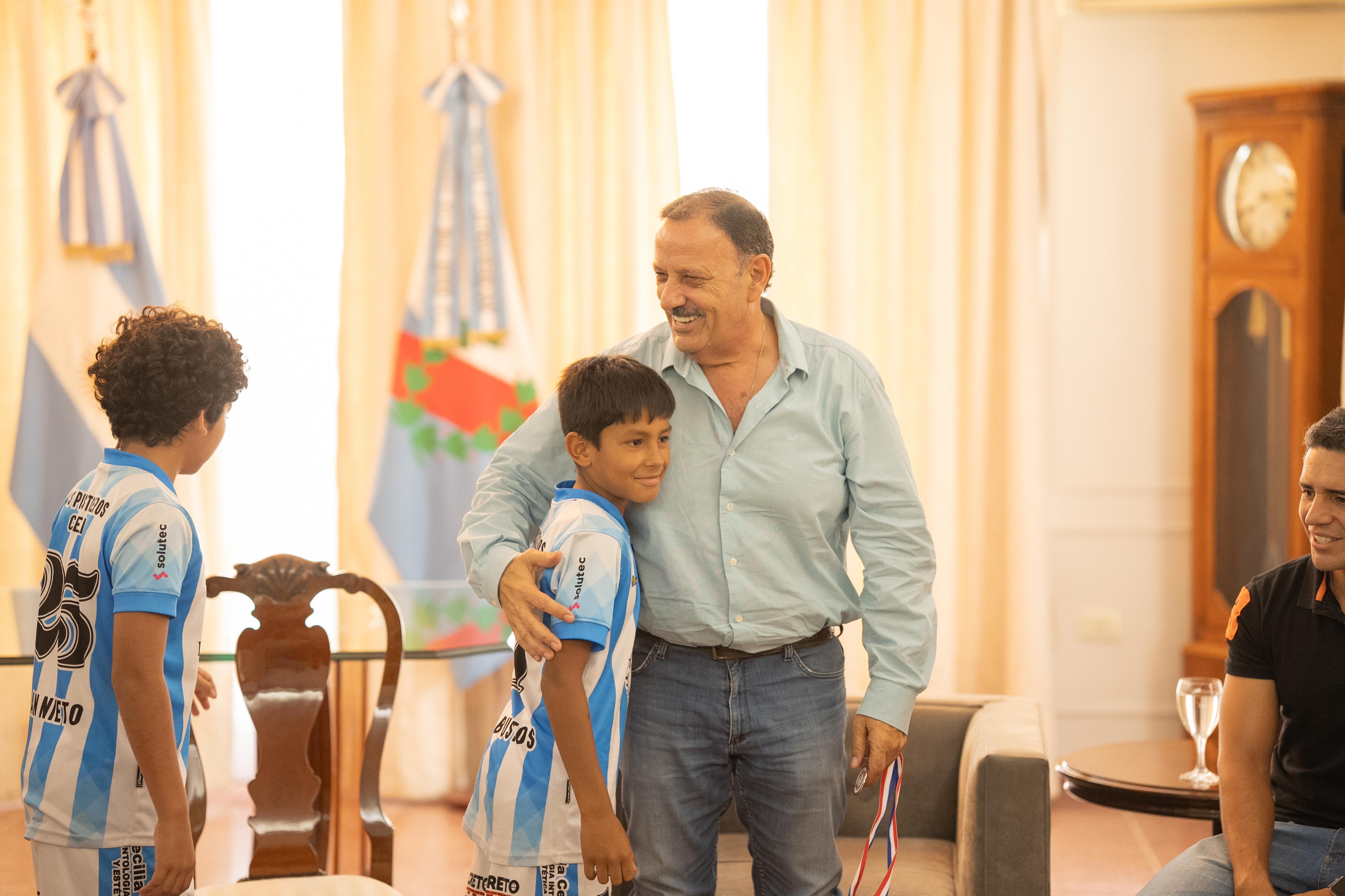 El gobernador Ricardo Quintela recibió, en la Residencia Oficial, al profesor Lucas Ceballos, coordinador y presidente del Centro y Escuela de Fútbol Infantil Los Pistoleros, y a un grupo de pequeños jugadores de la institución, quienes, junto a sus familias, le agradecieron su constante colaboración con la entidad deportiva.