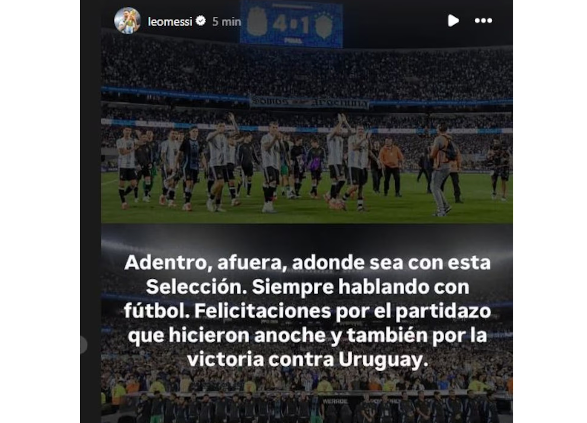 “Adentro, afuera, adonde sea con esta Selección. Siempre hablando con fútbol. Felicitaciones por el partidazo que hicieron anoche y también por la victoria contra Uruguay”, escribió Messi este miércoles por la mañana en su cuenta de Instagram (@leomessi) junto a una foto de sus compañeros, hinchas y cuerpo técnico.