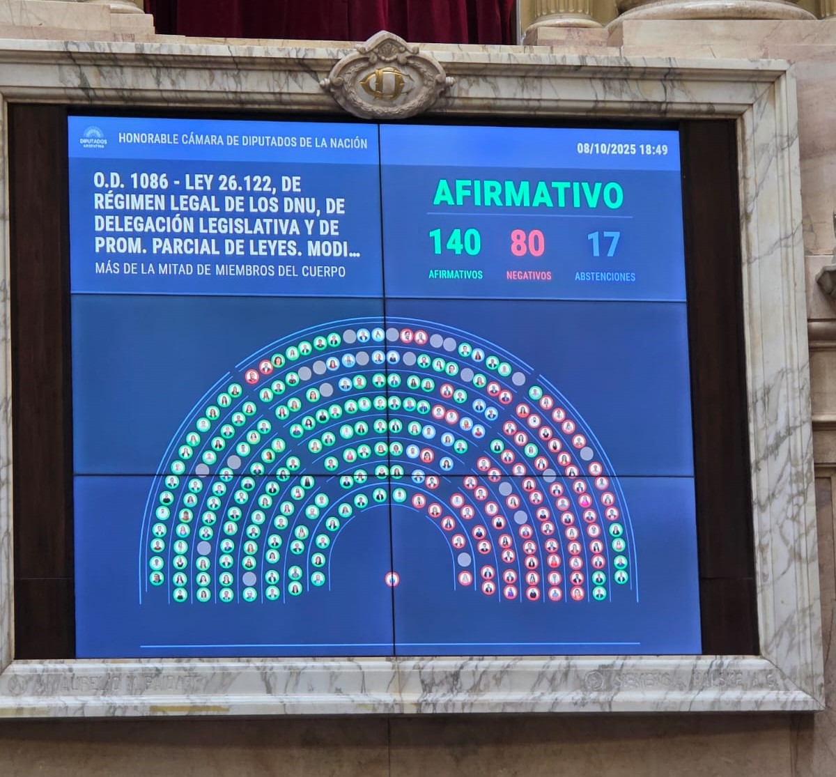 La Cámara de Diputados aprobó la reforma del Régimen Legal de los DNU con 140 votos afirmativos, 80 negativos y 17 abstenciones. En la votación particular, el artículo 3 no alcanzó la mayoría absoluta y la norma deberá volver al Senado.