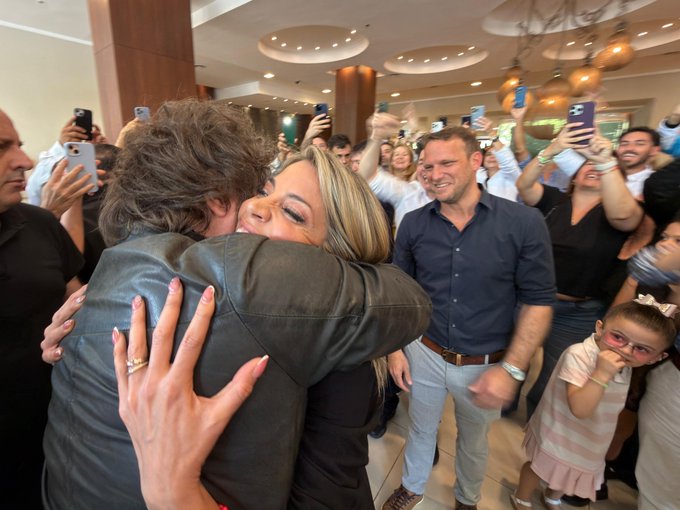 El mandatario estuvo acompañado por su hermana y secretaria general de la Presidencia, Karina Milei, y por la candidata a diputada nacional, la exvedette Virginia Gallardo.