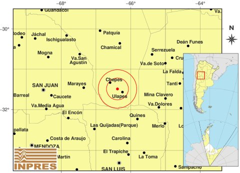 Su epicentro fue a 17 km al Noroeste de Ulapes; 25 km al Sureste de Chepes; 89 km al Oeste de Chancaní -31.493 (lat) -66.38 (long), con una profundidad de 146 kilómetros.