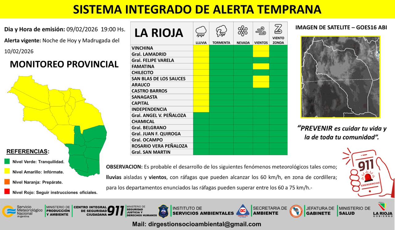 El reporte del SIAT precisó que el alerta por lluvias rige para los departamentos Vinchina, General Lamadrid, General Felipe Varela, Famatina, Chilecito, San Blas de los Sauces, Arauco, Castro Barros, Sanagasta y Capital.