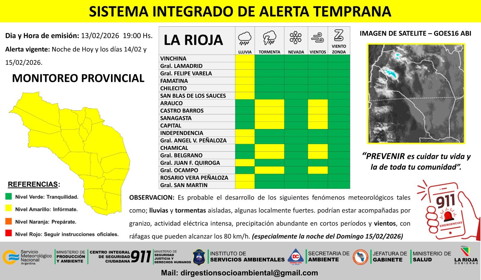 El alerta por lluvias rige para los departamentos Vinchina, General Lamadrid, General Felipe Varela, Famatina, Chilecito, San Blas de los Sauces, Independencia, General Ángel Vicente Peñaloza, General Juan Facundo Quiroga, Rosario Vera Peñaloza y General San Martín.