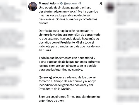 Adorni señaló que “todo lo que hacemos es con honestidad y plena conciencia de lo que tenemos enfrente: los que siempre van a hacer todo lo posible para que la Argentina no cambie. Quiero agradecer a cada uno de los que se tomaron el tiempo de escribirme y al apoyo incondicional del gabinete nacional y del Presidente”, añadió.
