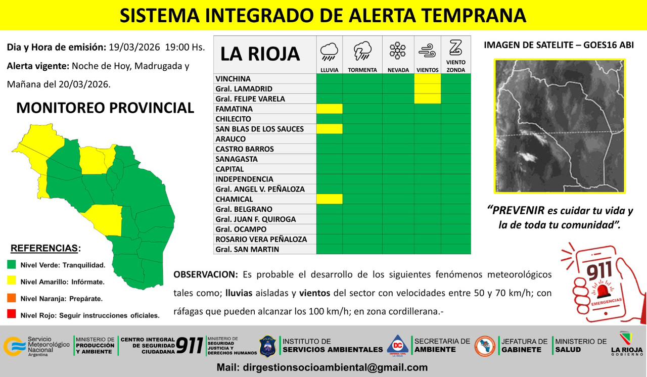 En tanto, los vientos afectarán a Vinchina, General Lamadrid y General Felipe Varela, con velocidades estimadas entre 50 y 70 km/h y ráfagas que podrían alcanzar los 100 km/h.