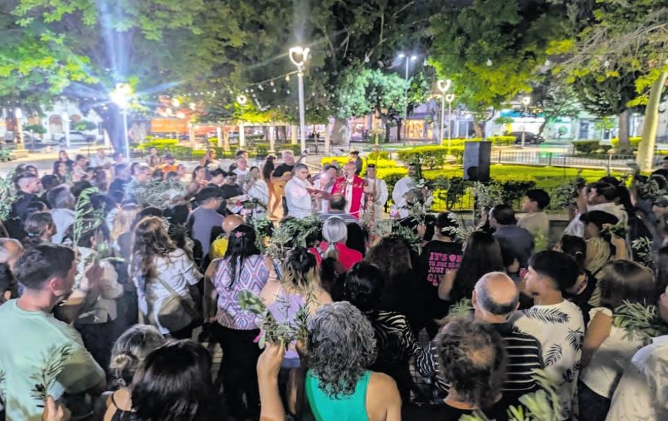 Durante la tradicional misa por el Domingo de Ramos, apenas el reloj marcó las 20, el Obispo Dante Braida convocó a los cientos de fieles presentes a que lo acompañaran a cruzar hasta el centro de la plaza 25 de Mayo, en el microcentro capitalino, para dar inicio a la ceremonia.