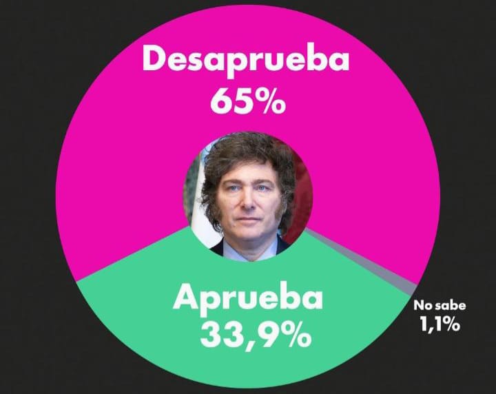 Según el informe difundido en abril, el 65% de los encuestados desaprueba la gestión presidencial, mientras que el 33,9% la aprueba y el 1,1% no tiene una opinión definida.
