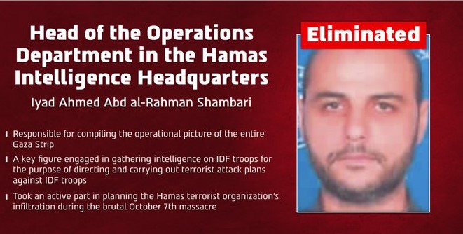 Según el comunicado, Shambari era responsable de elaborar la evaluación operativa de la situación en toda la Franja de Gaza para dirigir y ejecutar planes de ataque contra las tropas.